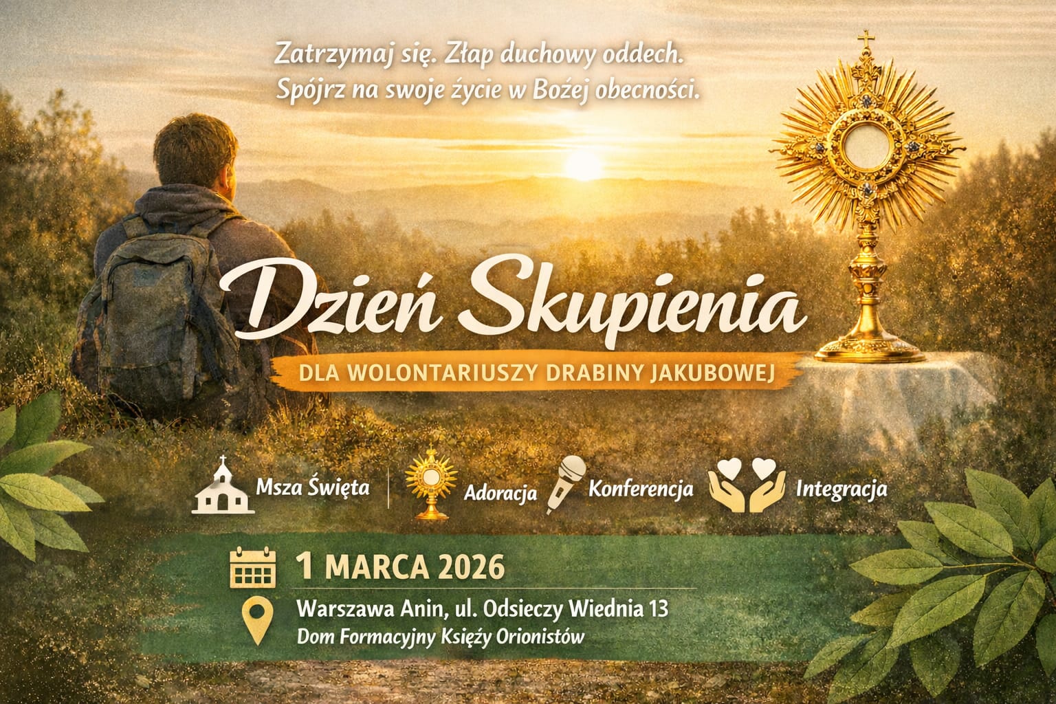 🕊 Dzień Skupienia dla Wolontariuszy Drabiny Jakubowej! Zatrzymaj się. Złap duchowy oddech. Spójrz na swoje życie z Bożej perspektywy. W programie : 🙏 Msza Święta | ✨ Adoracja | 🎤 Konferencja | 🤍 Integracja 📅 01.03.2026 r., godz. 10-19. 📍 Warszawa Anin, ul. Odsieczy Wiednia 13 (Dom Formacyjny Księży Orionistów). Koszt: 50 zł (płatne na miejscu). Jest też możliwość noclegu w razie potrzeby. Zapisz się już dziś!